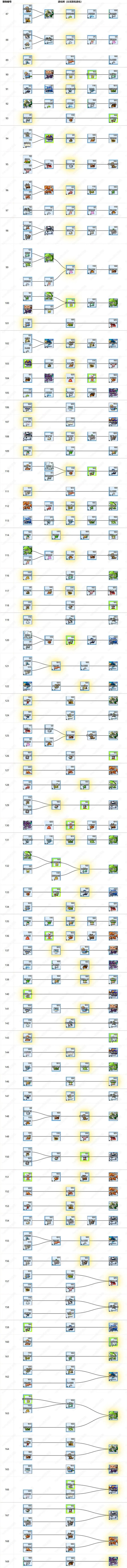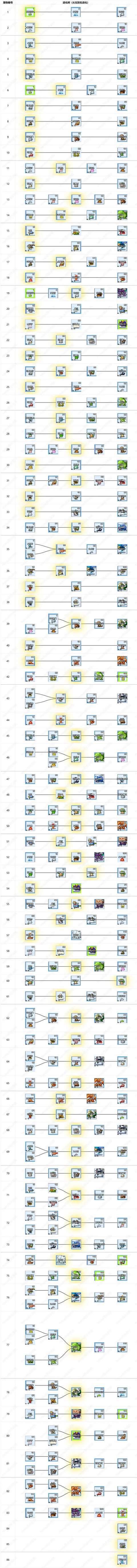 2、表格右边列是进化树,包括退化前两级和进化后两级,编号宠是周围有金色光芒的那个图标。部分宠是没有进化型和退化型的