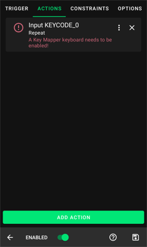 对于这个简单的演示,我将从KEYCODE选项卡中选择KEYCODE_0。这个动作将模拟按键盘上的0键。键映射器会让你知道你是否需要做任何额外的步骤,使行动可以工作。在图片中,操作中有一条错误消息,告诉您“启用”一个键映射器键盘。轻按该操作会将您带到正确的位置,以便您可以修复错误。我将介绍如何设置一个关键代码动作,因为这些是最常用的。
